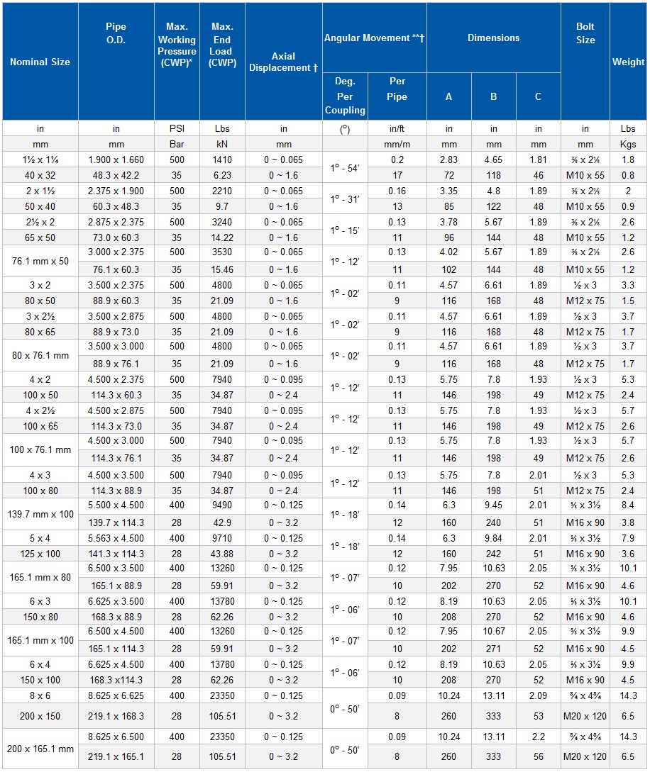 † Allowable Axial Displacement and Angular Movement (deflection) figures are for roll grooved standard steel pipe. Values for cut grooved pipe will be double that of roll grooved. These values are maximums; for design and installation purposes these figures should be reduced by: 50% for ¾” – 3½”; 25% for 4” and larger to compensate for jobsite conditions.